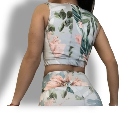 Top confeccionado con nuestra tela exclusiva LAGUNA importada de Brasil, en colores pasteles grises, verde y coral, dibujos a mano digitalizados con la mayor calidad del mercado brasilero. Forrería interna. Costuras planas y reforzadas para un mayor confort.