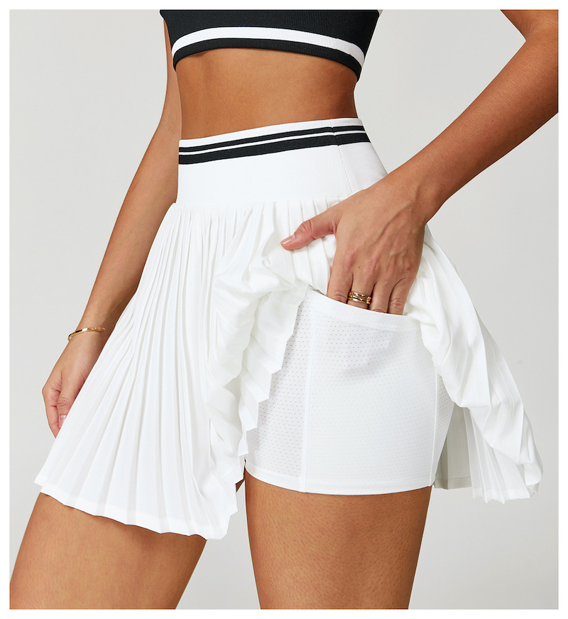 falda montecarlo blanco, Una versión renovada de la falda de tenis original, está diseñada con pliegues marcados, cintura ancha super soft adaptable al cuerpo, tiene debajo un short en tela DRY-FIT (para una mejor comodidad y libertad en tus movimientos). También trae bolsillos perfectos para guardar una pelota de tenis, las llaves o el celu. Está confeccionada con nuestro tejido Solar MAX. combinala con el top montecarlo para tener el outfit perfecto.