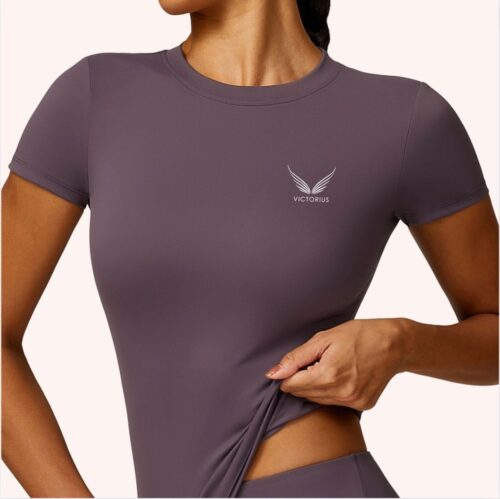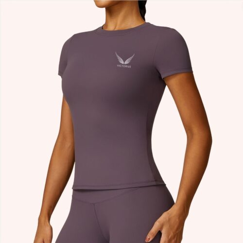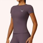 remera manga corta elastizada color uva MODELO BARCELONA, está confeccionada con nuestra tela importada exclusiva con fibra LYCRA® XTRALIFE™ y tecnología SOLARMAX® SEAMLESS que bloquea el 97,5% de los rayos UV, esta tiene cuello redondo, tela ajustada media que marca la cintura, tiene costuras planas y reforzadas para una mejor sujeción y soporte.