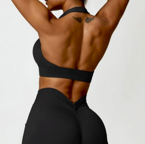 Top frunce caicos color negro, confeccionada con nuestra tela importada linea SEAMLESS (NYLON, POLIAMIDA, ELASTANO), muy buen soporte y sujeción, tela super suave al tacto. tasas soft removibles, espalda abierta, detalle de frunce frontal