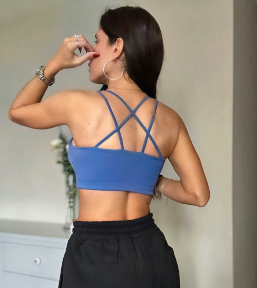 Top melody color azul, confeccionada con nuestra tela versátil importada poliamida y elastano, muy buen soporte y sujeción, tela super suave al tacto. tasas soft removibles, doble bretel y espalda cruzada con cintura ancha, en la parte frontal posee un escalón en v con corte de princesa para dar el toque final de sutileza y glamour.