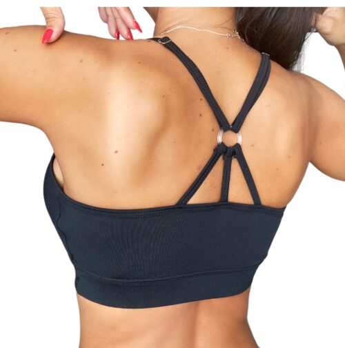 Top confeccionado con nuestra tela exclusiva POLIESTER CON ELASTANO, en color NEGRO, con detalles en tiras en espalda, que se unen con circulo de acrílico. posee reguladores en tiras para una mayor comodidad y sujeción. Este modelo es sin tasas soft pero tiene preparado el bolsillo interno por si quieres agregarle.